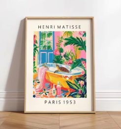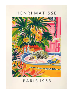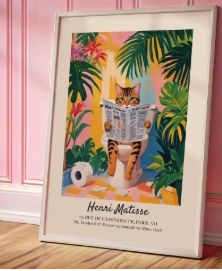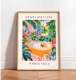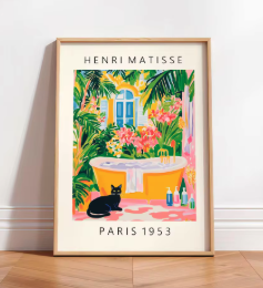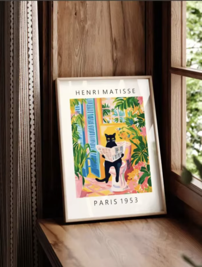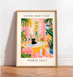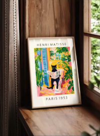 Com estética vibrante e lúdica, esse pôster une o traço moderno de Matisse à irreverência de um gato preto numa cena tropical. Ideal para decorações criativas.